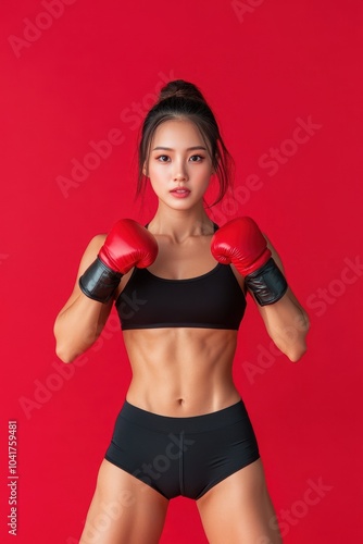 Fit Woman in Red Gloves Posing for Boxing Shot
