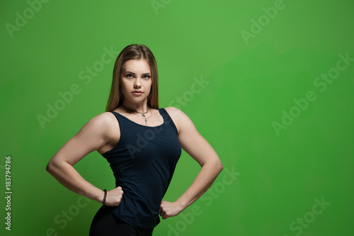 Fit young woman showing muscles, looking at the camera and posing over green background. Fitness and healthy lifestyle concept.