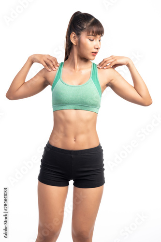 Fitness woman warming up isolated on white background. Asian lady. Shoulder stretch.