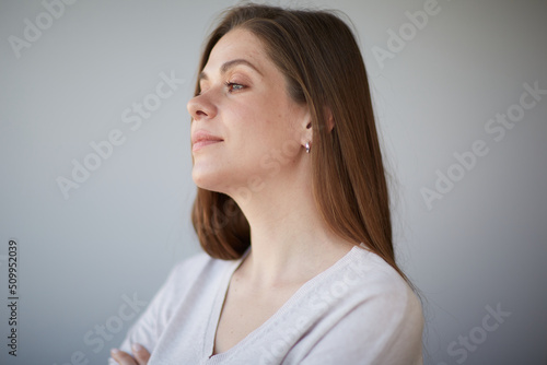 Focused thinking woman face portrait. Girl looking away. Female head shot with shallow depth of field.