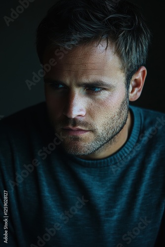 Focused young man in casual sweater deep in thought in a dimly lit room
