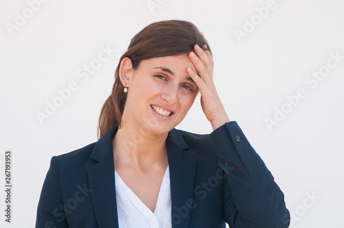Forgetful office worker reminding important thing. Young woman in office jacket touching head and looking at camera. Headache or bad memory concept