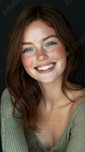 freckled girl with radiant smile under natural light, vibrant and joyful atmosphere, studio background, detailed and engaging focus
