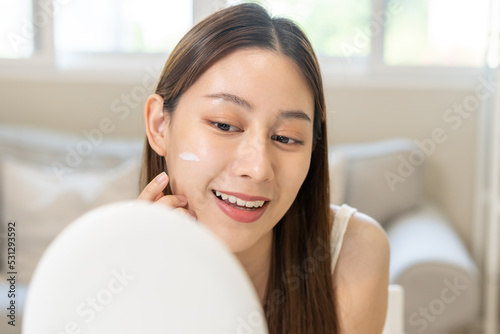 Fresh healthy skin, beautiful smile of asian young woman, girl looking at mirror, applying moisturizer on her face, putting cream treatment before makeup cosmetic routine at home. Facial Beauty.
