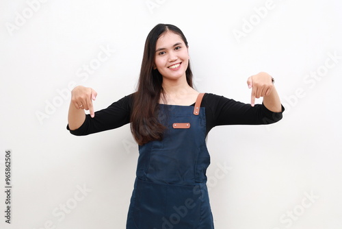 Friendly asian barista in blue apron pointing fingers down, showing your logo banner, standing over white background