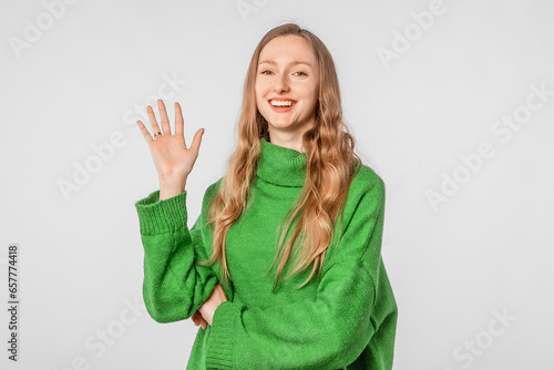 Friendly blonde woman saying hello, waving hand, say hi, greeting, welcome gesture, smiling happy, standing in trendy knitwear green sweater against white studio background