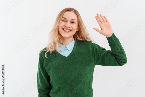 Friendly cheerful blonde girl smiling, saying hi and waving hand to greet person, make hello gesture, welcome someone, wears casual clothes. Indoor studio shot on white background