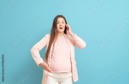 frightened young pregnant woman on blue background calls by mobile phone, discharge of amniotic fluid, the beginning of labor process