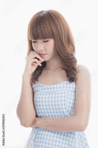 Front view close-up portrait of young beautiful Asian woman with curly long dark brown hair in light blue checked dress stand up straight isolated white background