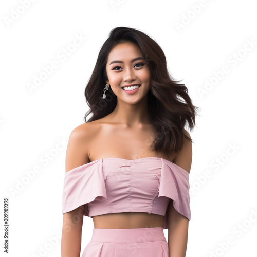 Front view mid shot of a beautiful Asian woman dressed in a pink off-shoulder crop top and high-waisted skirt, smiling on a white transparent background