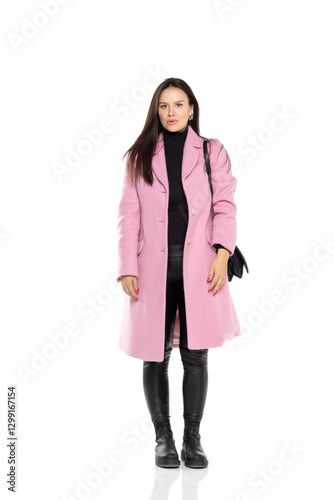 Front view of a woman in winter coat and black jeans posing on a white studio background