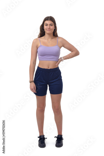 front view of a young girl standing with arm akimbo and looking at camera on white background