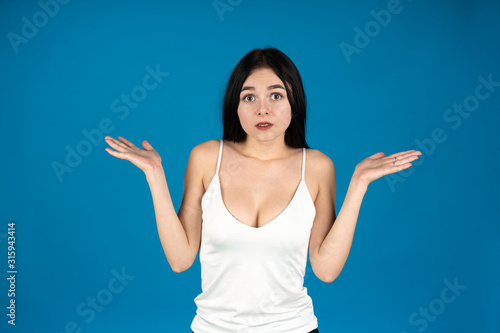 Front view of confused girl showing shrug gesture isolated on blue background