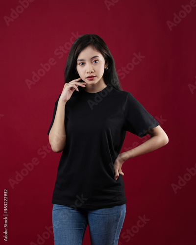 Front view white t-shirt Closeup on female body, woman girl in empty black t-shirt isolated on red background. Design woman t-shirt template and mockup for print.