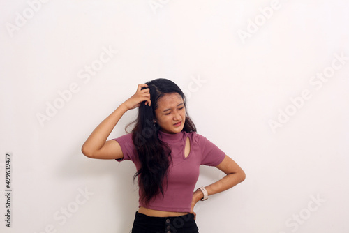 frustrated Asian woman holding head with headache looking at camera isolated on white background