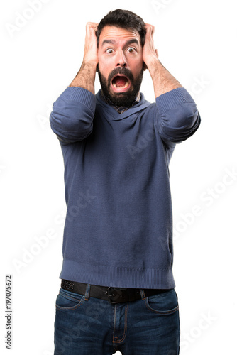 Frustrated handsome brunette man with beard on white background