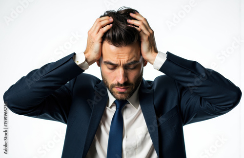 Frustrated man in business suit holding head with hands expressing stress or confusion