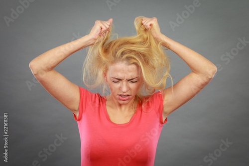 Frustrated woman holding her damaged blonde hair