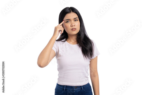 Frustrated young Asian woman touching temple with confused expression, thinking hard, isolated on transparent background