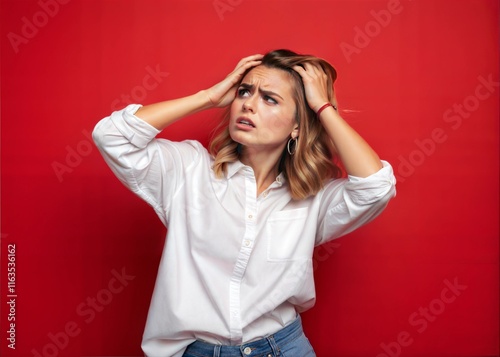 Frustrated Young Caucasian Woman Rubbing Head – Studio Portrait with Red Background.