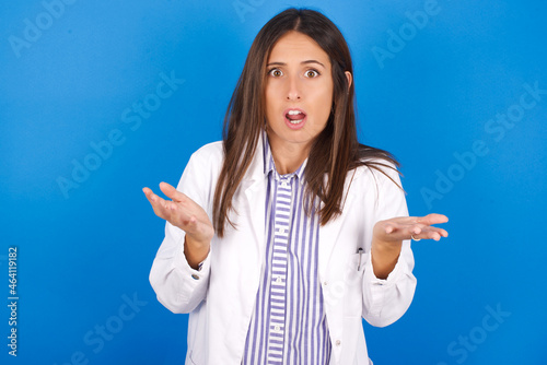 Frustrated young european doctor girl wearing white medical gown on white background feels puzzled and hesitant, shrugs shoulders in bewilderment, keeps mouth widely opened, doesn't know what to do.