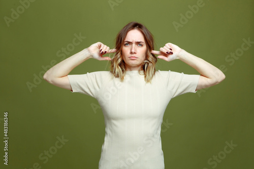 Frustrated young woman plug ears with fingers suffer from noise, disturbing noisy sound on green studio background