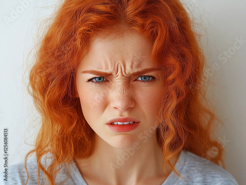 Frustrated young woman with curly red hair and blue eyes, showing displeasure. Her facial expression conveys annoyance and confusion