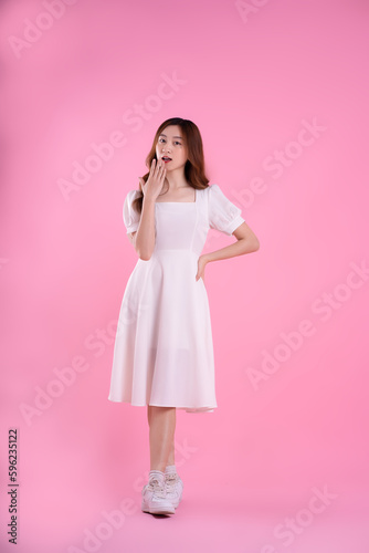 full body image of asian woman in skirt posing on pink background
