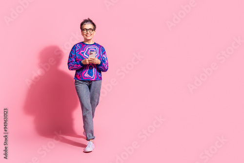 Full body photo of attractive senior woman hold device walking dressed blue colorful clothes isolated on pink color background