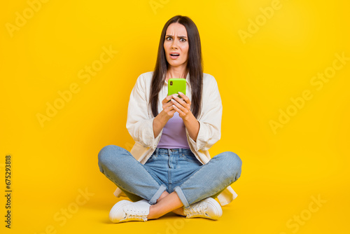 Full body photo of unsatisfied impressed lady sit floor stare use smart phone isolated on yellow color background