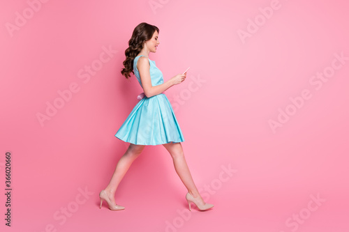 Full body profile photo of wavy charming lady walking festive event prom party graduating college university browsing telephone wear blue mini dress stilettos isolated pink color background