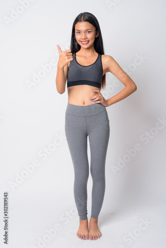 Full body shot of happy young Asian woman giving thumbs up ready for gym