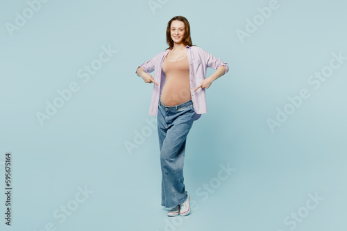 Full body smiling happy young pregnant future mom woman with belly tummy with baby wearing casual clothes point index fingers on stomach isolated on plain blue background. Maternity pregnancy concept.