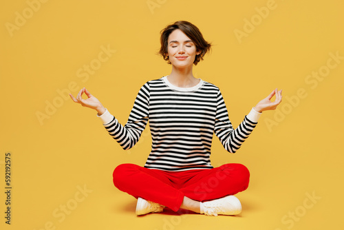 Full body spiritual young woman in casual black and white shirt sit hold spreading hands in yoga om aum gesture relax meditate try calm down isolated on plain yellow color background studio portrait