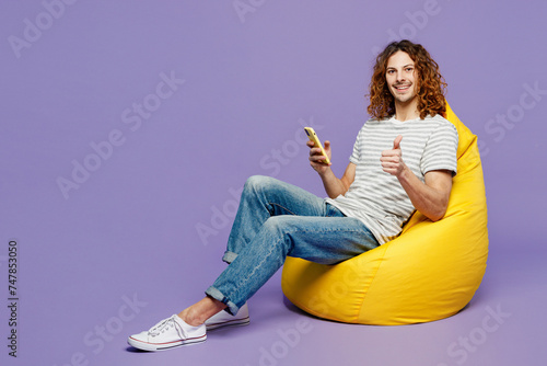 Full body young man he wears grey striped t-shirt casual clothes sit in bag chair hold in hand use mobile cell phone show thumb up isolated on plain pastel light purple background. Lifestyle concept.