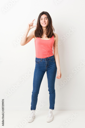 Full body young woman on white background holding something little with forefingers, smiling and confident.
