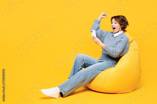 Full body young woman she wear grey knitted sweater shirt casual clothes sit in bag chair hold in hand use mobile cell phone do winner gesture isolated on plain yellow background. Lifestyle concept