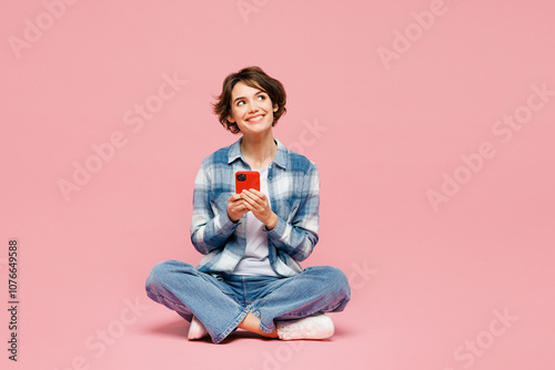 Full body young woman wear blue shirt white t-shirt casual clothes sits hold in hand use mobile cell phone look aside isolated on plain pastel light pink background studio portrait. Lifestyle concept.
