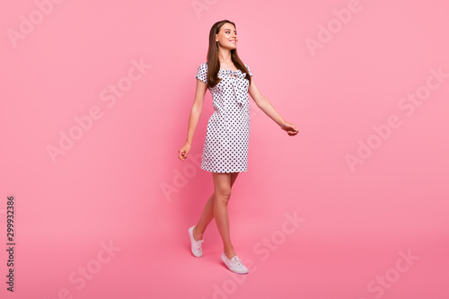 Full length body size photo of cheerful confident nice lady walking towards company of her friends while isolated with vivid background
