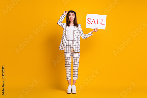 Full length body size photo of shocked amazed girl keeping sale sign taking off sunglass staring smiling isolated on vivid color background