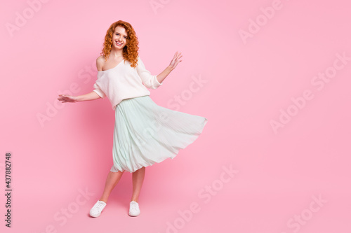 Full length body size photo of with red hair woman smiling wearing stylish spring clothes isolated on pastel pink color background