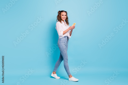 Full length body size profile side view of lovely teen cheerful girl using gadget 5g app going isolated on vivid blue color background