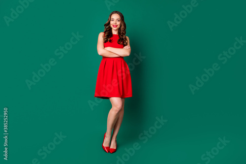 Full length body size view of her she nice-looking attractive lovely charming exquisite slim fit cheerful cheery wavy-haired lady posing folded arms isolated over green color background