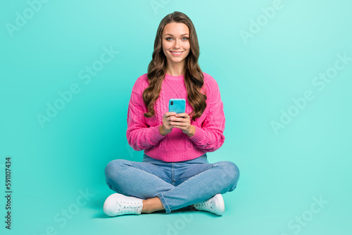 Full length photo of adorable stunning positive satisfied girl sitting floor use modern technology device isolated on cyan color background