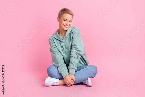 Full length photo of cheerful pretty lady wear comfort clothes enjoy free time good mood isolated on pink color background