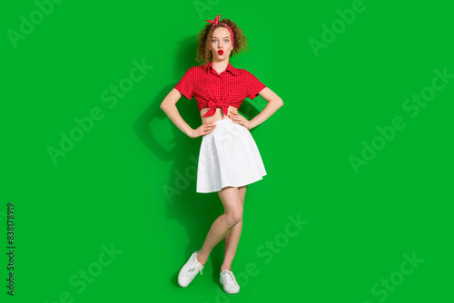 Full length photo of lovely young lady posing model pouted lips dressed stylish red retro garment isolated on green color background