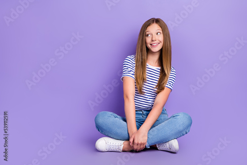 Full length photo of positive good mood girl wear striped t-shirt sit on floor look empty space isolated on purple color background