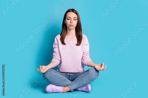 Full length photo of pretty lovely student girl sitting floor crossed legs meditate concentrate find peace motivate wear violet pullover sneakers denim isolated blue color background