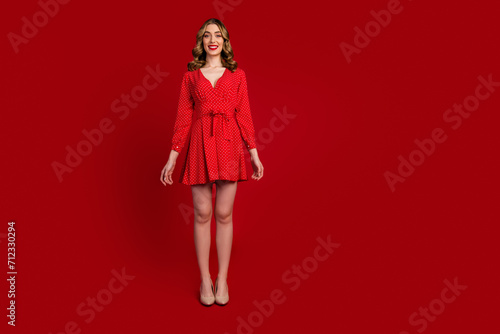 Full length photo of stunning pretty person posing elegant mini dress empty space isolated on bright red color background