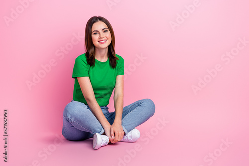 Full length photo of sweet adorable girl wear green crop sitting legs crossed empty space isolated pink color background